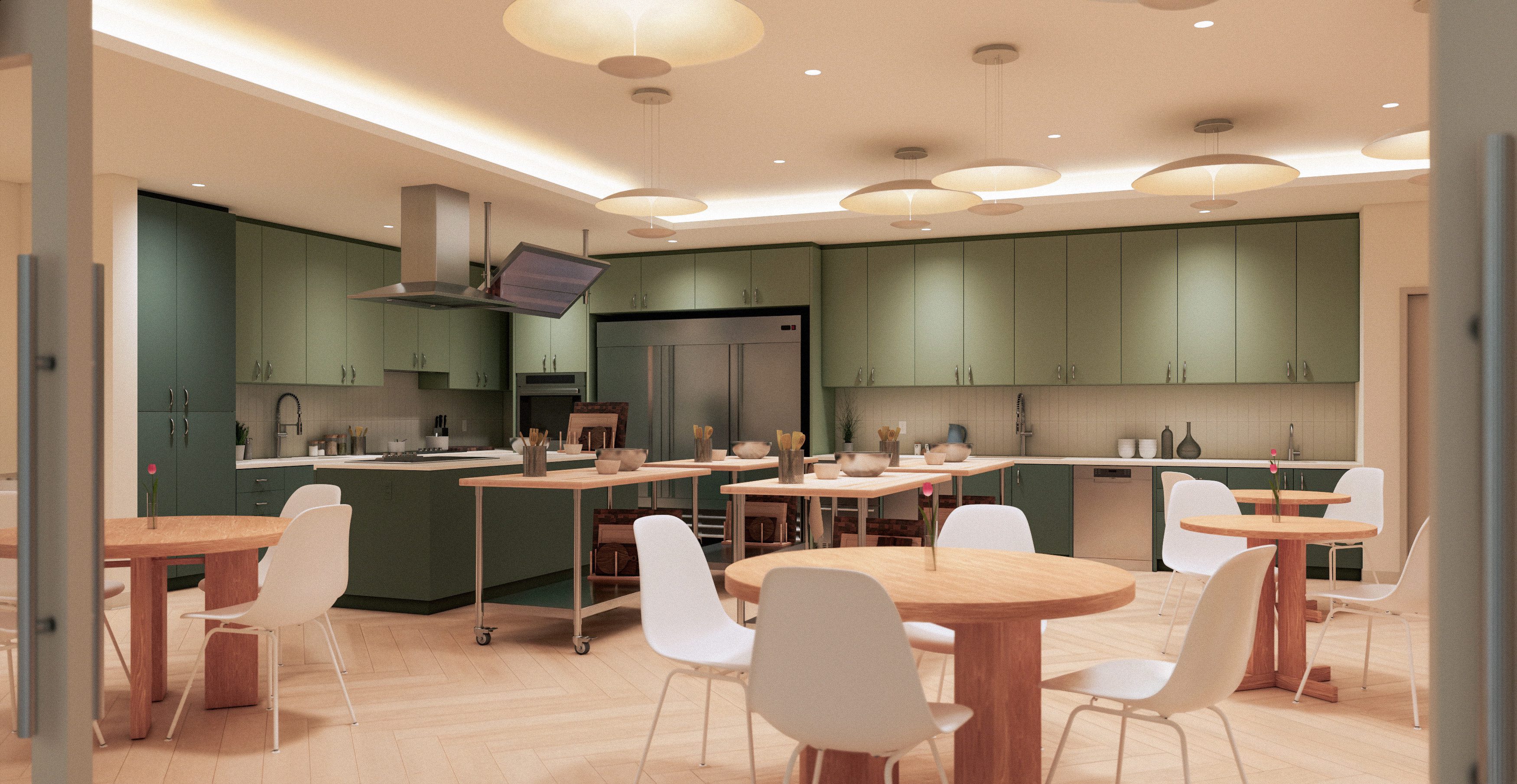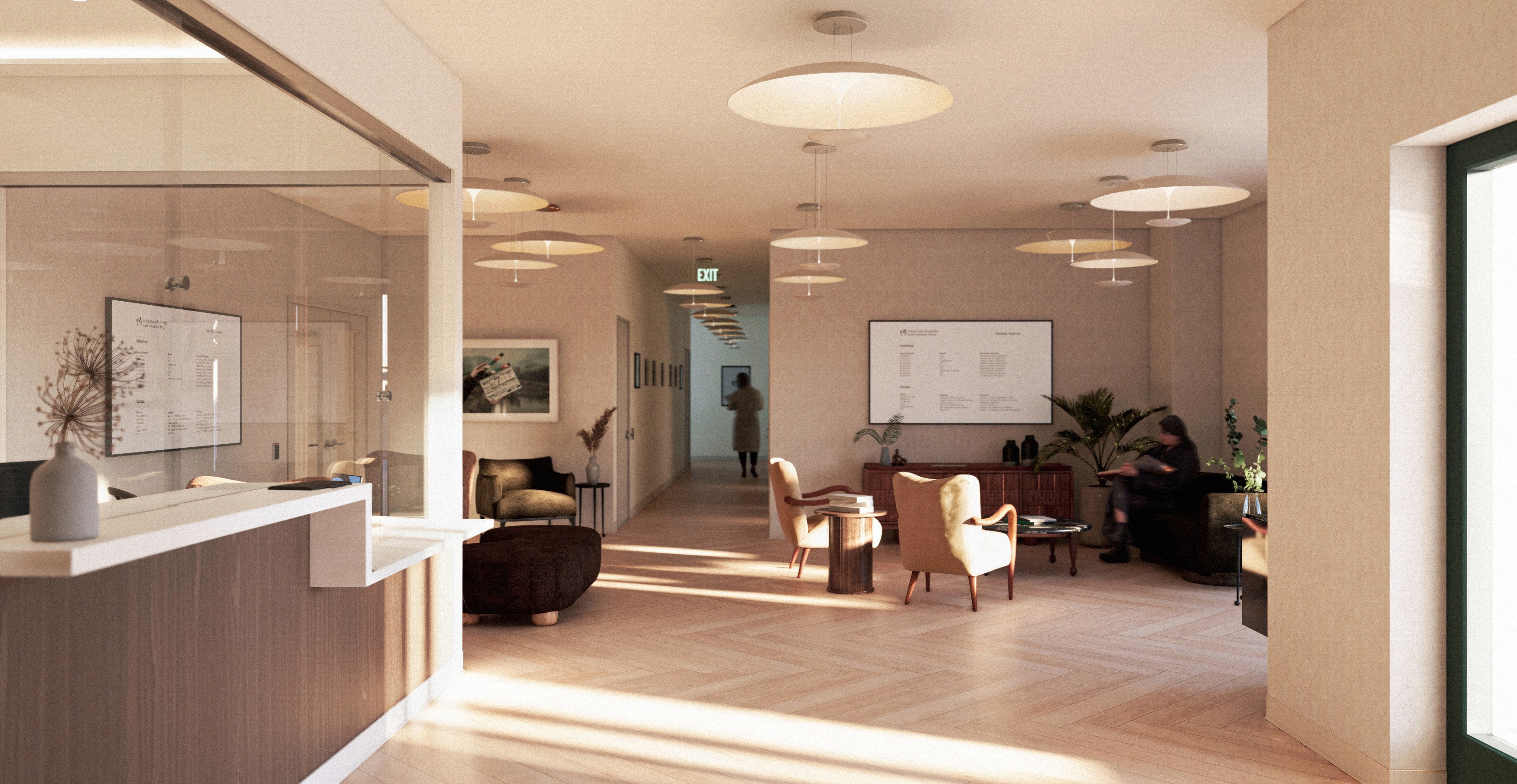 Institutes of Health is an innovative healthcare company that delivers proven solutions for chronic pain, brain injuries, PTSD, sleep problems, and perscription drug addictions for the workers’ compensation community. After successful completion of their Anaheim facility, IOH brought on Always Already as the architectural and interior designer for the adaptive reuse design of a historic building in Burbank. Similarly to the Anaheim facility, the mandate was to design a center where, under one roof and in an integrated format, psychological, psychiatric, medical, occupational therapy, physical therapy, nutritional coaching and culinary instruction would all take place. AA created a space plan for the considered flow between patients in day-long programs, those coming for single-provider visits, and the staff interacting across departments, with the communal kitchen and dining room right in the center as the beating heart of the facility. The interior design was guided by the imperative to create an elevated, warm space that understood the unique visual and acoustic needs of different patient groups, including those with Traumatic Brain Injuries, as well as a particular eye to the historic character of the building.